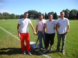 Il aura fallu pas moins de 2 heures à ces sympathiques dévoués pour mesurer les distances de l'aire de jeu (surfaces de but, surfaces de réparation, rond central...) et ainsi tracer à la peinture les différentes lignes d'un terrain de football...