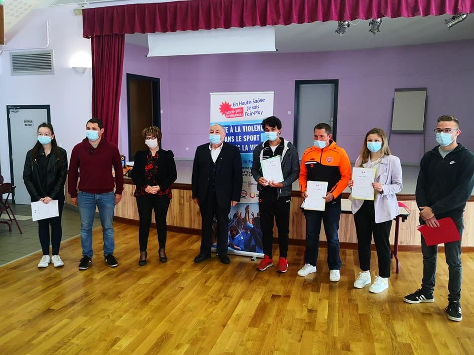 C'est monsieur CAILLET, président du comité départemental de la Jeunesse, des Sports et de l'Engagement Associatif, qui a remis ces lettres de félicitations, accompagné de Madame Le Maire de CHAMPAGNEY, Marie-Claire FAIVRE, et en présence de Béatrice PY, adjointe de la municipalité de CHAMPAGNEY, en charge notamment des associaitions, de Quentin COUVREUR, vice-président de la commission des sports de CHAMPAGNEY et de Philippe PARISOT, conseiller municipal de CHAMPAGNEY et également membre du comité départemental de la Jeunesse, des Sports et de l'Engagement Associatif... Ces lettres de félicitations viennent en quelque sorte mettre en avant l'action menée par nos trois bénévoles, en faveur notamment de nos plus jeunes licenciés, puisque cette saison, Tiffanie SALVI encadre nos footballeuses U8F, Orlando GENGA gère notre catégorie U13G, alors que Benjamin HOUILLON est lui, en charge de notre catégorie U15G...