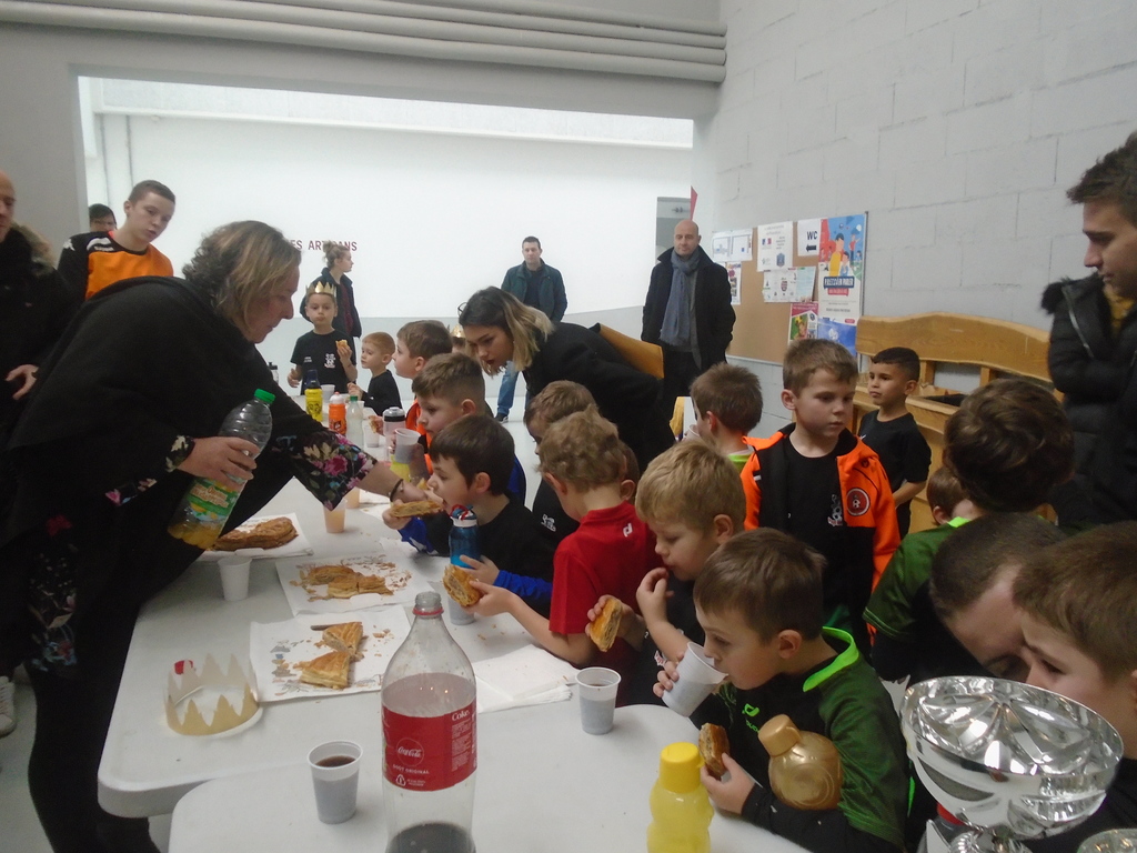 Parmi les 21 joueurs U7G présents, ce sont Nolan BIRGY, Alexis COROMINA et Loucas HOFFMANN, qui ont eu la joie et le plaisir de découvrir une fêve dans leur part de galette et qui ont donc été coiffés d'une couronne...