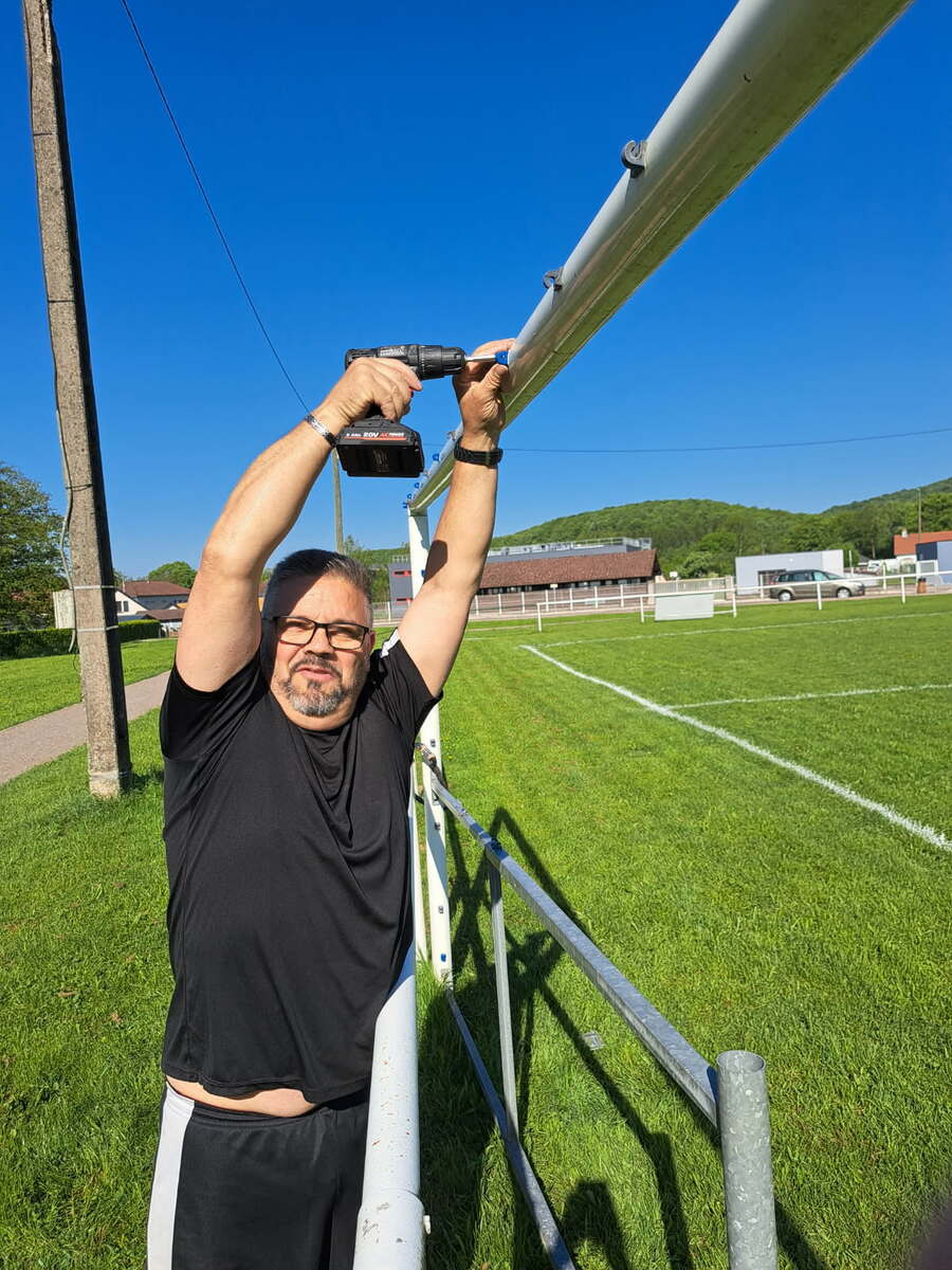 Samedi matin, Omar AZRARAD, dirigeant U11F et joueur Séniors G du FC PAYS MINIER, une fois l'installation des quatre buts de football à 5 réalisée pour le plateau U11F, s'est chargé de remplacer ces attaches, assisté de votre serviteur, mondialement connu pour ses dons de bricoleur...