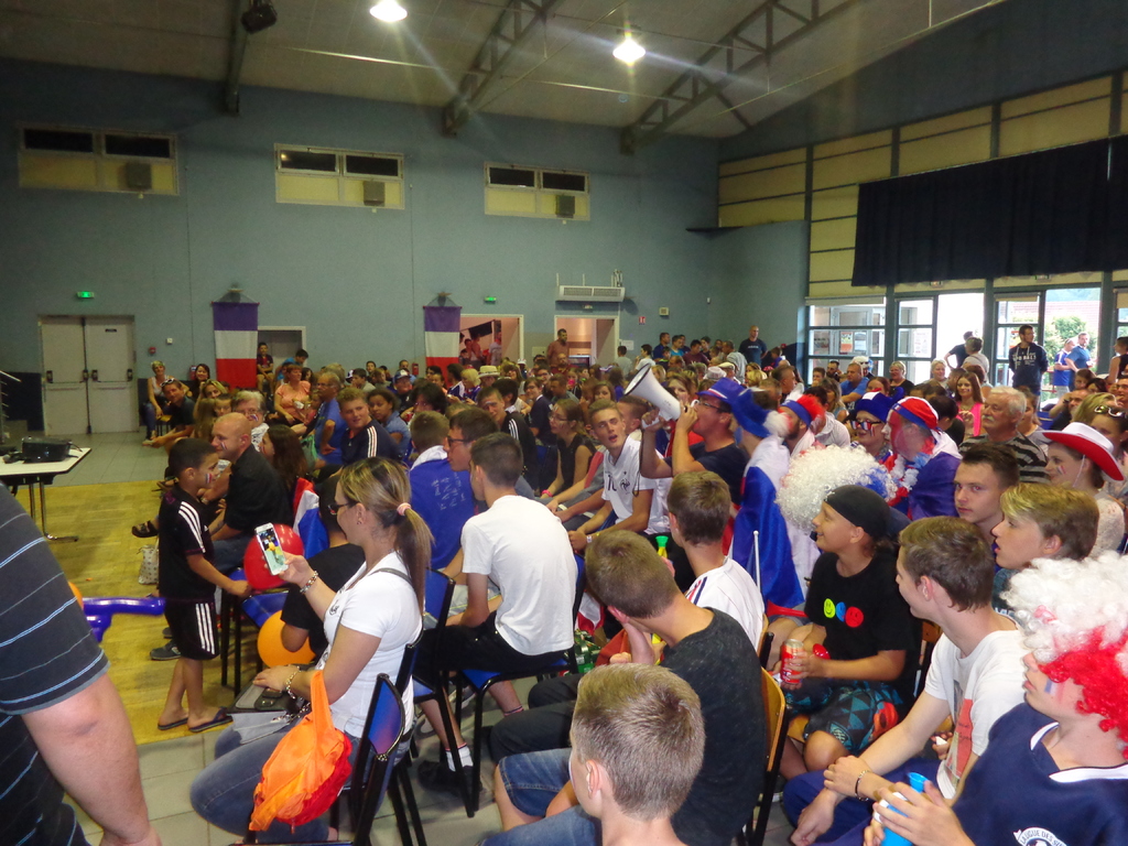 Certains se démènent d'ailleurs comme pas possible pour mettre l'ambiance dans la salle des fêtes... Grimés, habillés aux couleurs de l'équipe de FRANCE, ces supporters chantent très fort pour mettre l'ambiance et ainsi permettre à de nombreuses personnes présentes de garder de grands souvenirs de ces soirées passées en salle des fêtes de PLANCHER-BAS...