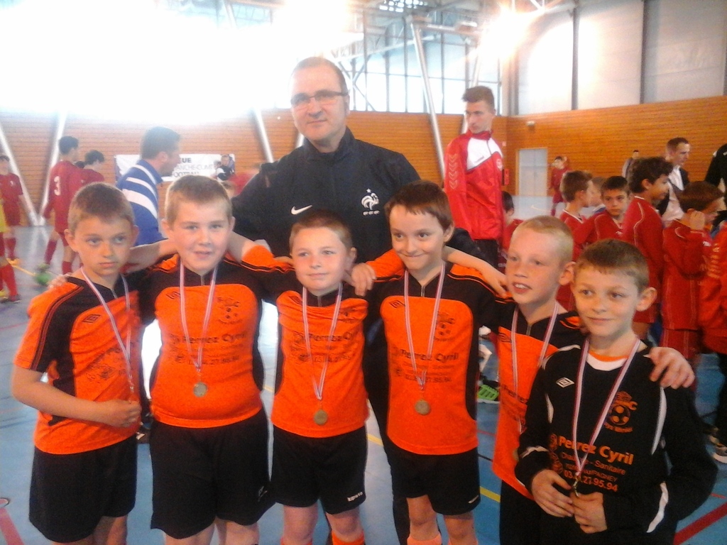 Et puis, une fois ce tournoi amical terminé et un repas tiré du sac dévoré..., nos jeunes footballeurs U8 et U9 se sont vus remettre une médaille des mains du sélectionneur de l'Equipe de FRANCE de FUTSAL, Pierre JACKY... Cool !