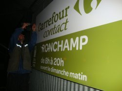 En effet hier, à la tombée de la nuit, Stéphane VUILLEMEY et votre serviteur se sont rendus au stade L.O. FROSSARD de RONCHAMP afin d'installer le panneau publicitaire de l'un de nos derniers sponsors..., CARREFOUR CONTACT !