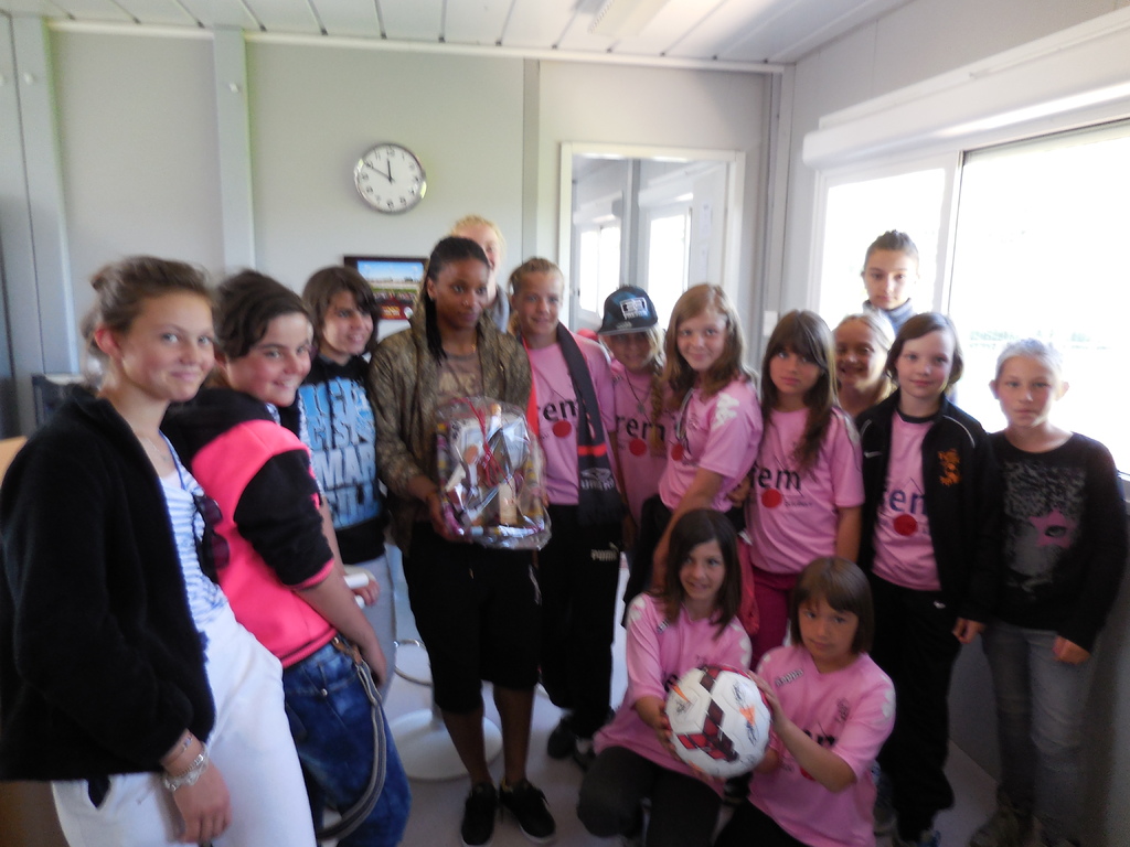 Elodie a alors annoncé à nos jeunes footballeuses rose et noir qu'elle leur avait apporté à chacune un petit cadeau... Ainsi, chacune s'est vue remettre des mains d'Elodie THOMIS, une paire de chaussures de football ou un maillot de football qu'elle a porté à l'occasion d'un match avec l'équipe de FRANCE... Vous imaginez la joie de nos joueuses... C'est d'ailleurs l'occasion de souligner qu'Elodie THOMIS prend à coeur le fait d'être la marraine de notre Ecole Féminine de Football... En effet, elle a du penser plus d'une fois à nos joueuses pour rassembler toutes ces tenues... Tout cela est simplement formidable ! Merci Elodie...
