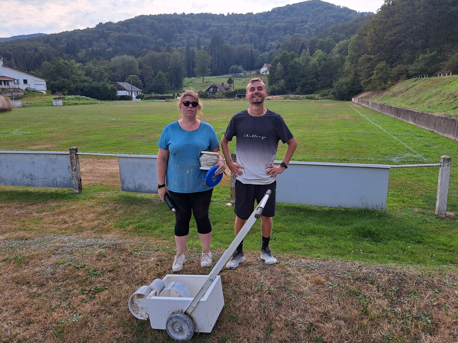 En effet, nous nous sommes retrouvés les trois vendredi dernier, en après-midi, afin de mesurer, tendre le cordon et tracer les différentes lignes nécessaires à la bonne tenue des rencontres de football à 8 et à 11...
