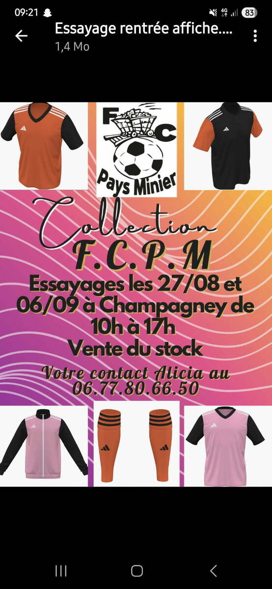 Une séance d'essayage des articles de la boutique du FC PAYS MINIER (survêtements, maillots, shorts, chaussettes...) est proposée ce mercredi 27 août, de 10 heures à 17 heures, au stade de CHAMPAGNEY...