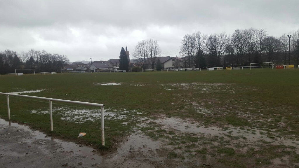 Trois séances d'entraînement sont d'ores et déjà délocalisées dans le gymnase de La Filature de RONCHAMP, en raison de l'état des terrains et de la météorologie (photo du terrain de CHAMPAGNEY, prise ce dimanche matin)... Voici les catégories concernées...