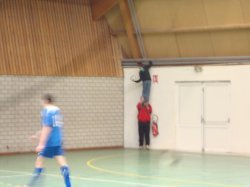 C'est qu'après un tir d'un grand joueur d'une équipe U15 participante au tournoi du FCPM, le ballon, pourtant spécial FUTSAL..., s'est bloqué dans la partie supérieure du gymnase...