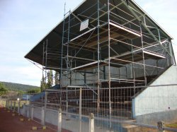 Après la consolidation des poutres porteuses à l'arrière des tribunes, la création d'une rampe d'accès pour personnes handicapées, c'est au tour de la charpente métallique de prendre un coup de neuf...