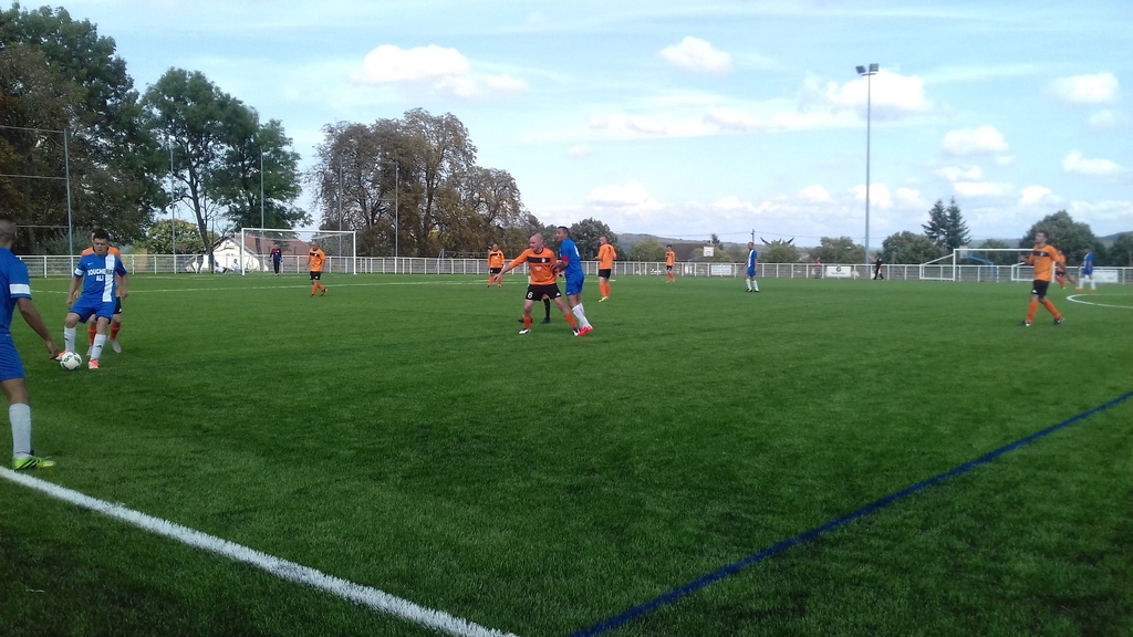 L'entame de match des partenaires du capitaine, Romain JOMINET, a d'ailleurs été très bonne... La preuve, nos orange et noir ouvrent le score dès la 2'... Suite à un coup-franc tiré par Maxence POINSOT, Maxence PAROLA, place une tête imparable pour le gardien local... 1 à 0 pour nos orange et noir, avec donc un premier but sous nos couleurs, pour Maxence PAROLA...